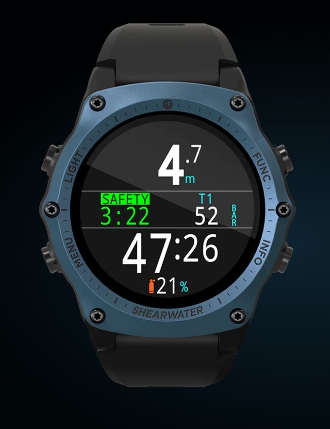 The Shearwater Teric is the premium choice for divers who want a full-featured technical computer in a stylish watch-style form. Its brilliant AMOLED screen is one of the clearest on the market — perfect for low-vis dives at Veteran’s Park or deep wrecks off the coast.